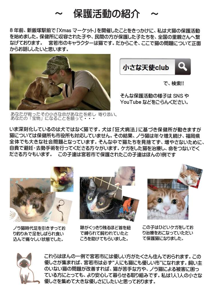 8年前、新飯塚駅前で「Xmasマーケット」を開催したことをきっかけに、私は犬猫の保護活動を始めました。保健所に収容された子や、民間の方が保護した子たちを、全国の里親さんへ繋なげております。 宮若市のキャラクターは猫です。だからこそ、ここで猫の問題について正面からお話ししたいと思います。